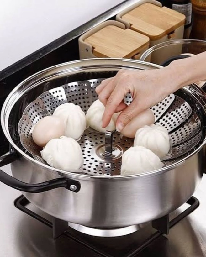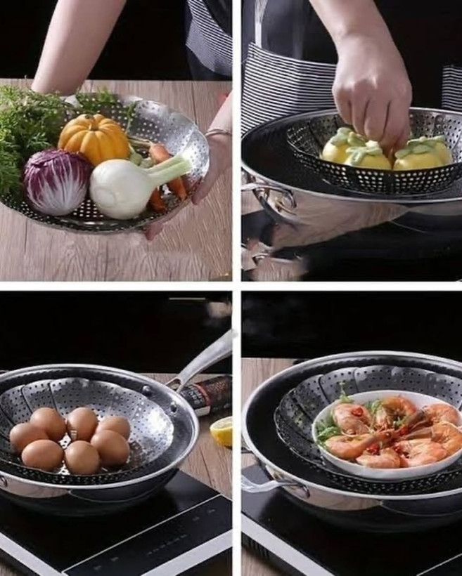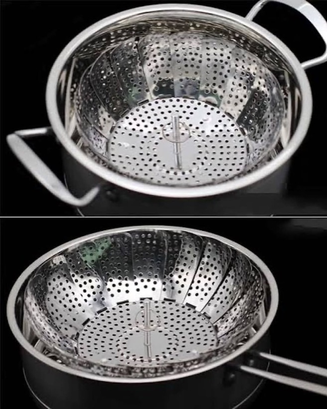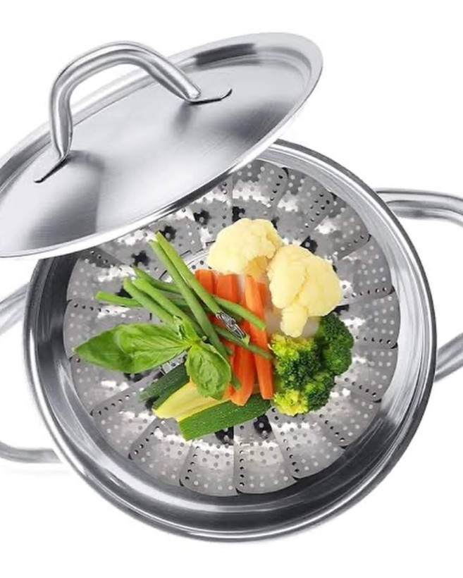 بخارپز استیل چندمنظوره دوستانی که رژیم میگیرن و باید سبزیجات رو به صورت بخارپز مصرف کنند یا مامایی که برای نی نی هاش ن تازه غذای کمکی شروع میکنند بهتره یدونه از این توری های بخارپز خونه داشته باشین داخل قابلمه قرار میدین قابلمه رو اب میریزین و روی این توری سبزیجات رو میذارین با بخار اب میپزه و تموم ویتامینا داخل خود سبزیحات باقی میمونه بهترین روش پخت در حقیقت همینه که برای شروع غذای کمکی نی نی ها و افرادی که رژیم میگیرن خیلی خوبه