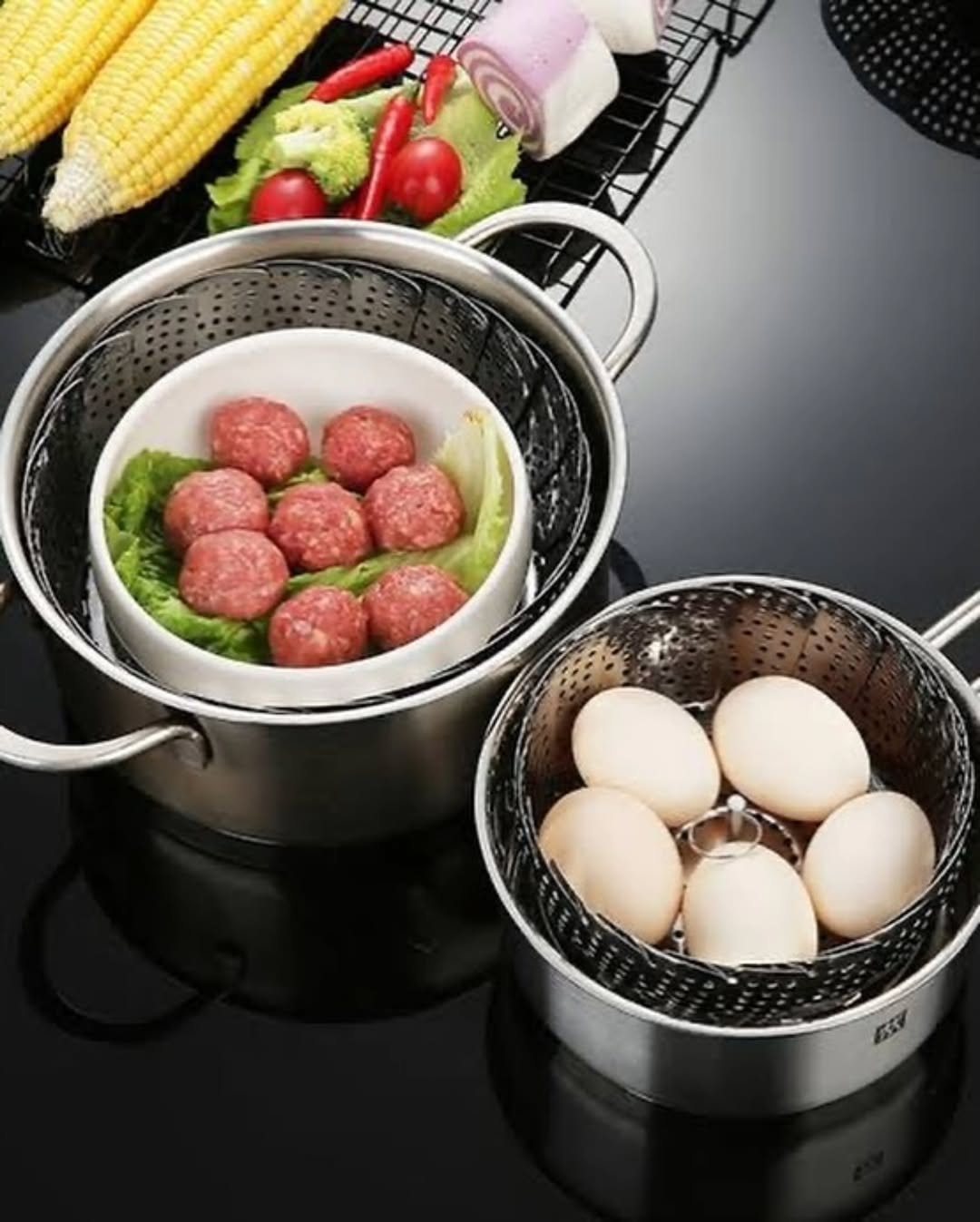 بخارپز استیل چندمنظوره دوستانی که رژیم میگیرن و باید سبزیجات رو به صورت بخارپز مصرف کنند یا مامایی که برای نی نی هاش ن تازه غذای کمکی شروع میکنند بهتره یدونه از این توری های بخارپز خونه داشته باشین داخل قابلمه قرار میدین قابلمه رو اب میریزین و روی این توری سبزیجات رو میذارین با بخار اب میپزه و تموم ویتامینا داخل خود سبزیحات باقی میمونه بهترین روش پخت در حقیقت همینه که برای شروع غذای کمکی نی نی ها و افرادی که رژیم میگیرن خیلی خوبه
